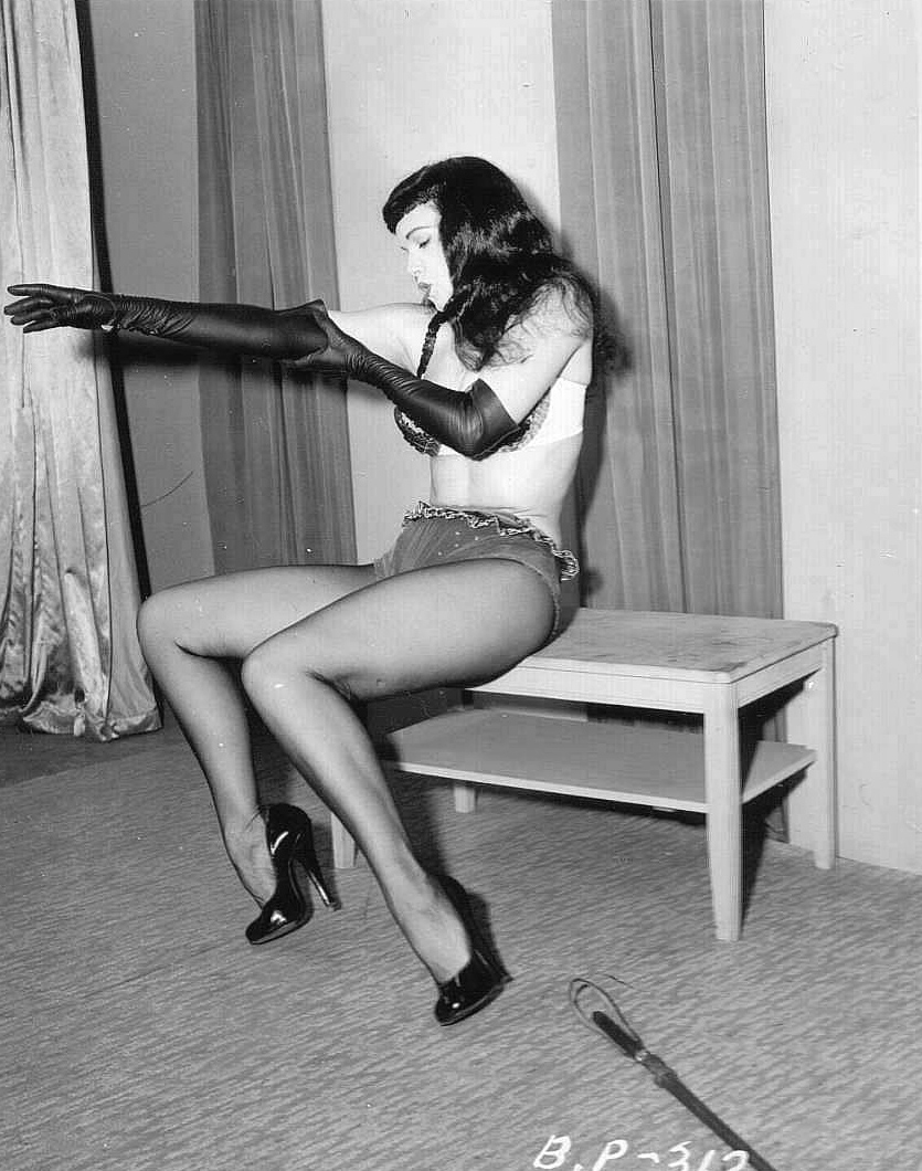 The BDSM photography which Page earned a reputation from is not all she did, though, nor how her career started. Before she became an erotic model (and even as she worked as one) she did more mainstream pinup work; just your typical mouth-open-drooling 50’s woman with a great ass. But once she met Cass Car, a musician who ran “camera clubs” where artist could “fully express themselves in the world of erotic art,” her mark on the world was signed, sealed and delivered.