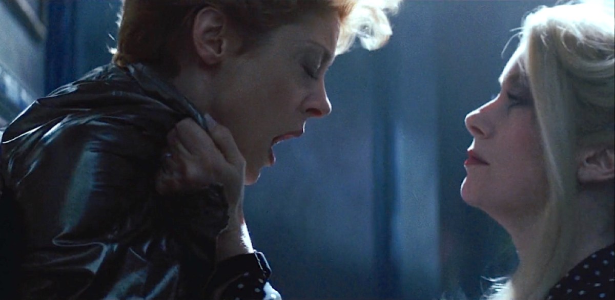 Catherine Deneuve holds Susan Sarandon up against a wall.