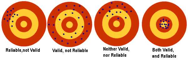 Let’s talk about validity and reliability and the difference between the two. Validity means that the results accurately describe what is being studied, while reliability means that the measures used will give consistent results in different populations and at different times. To illustrate: