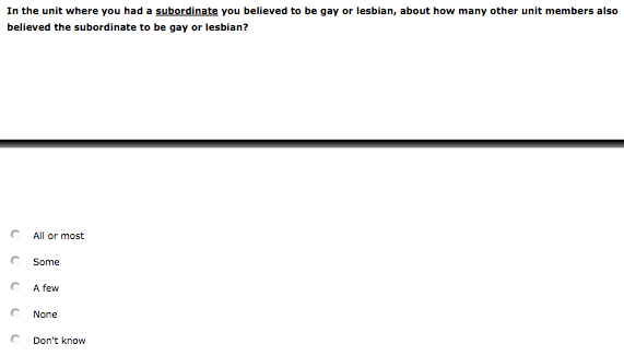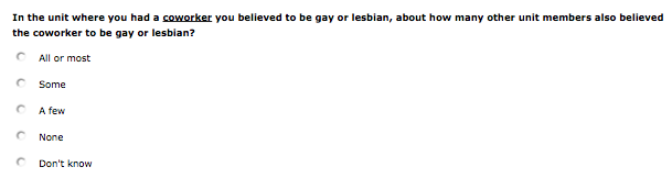 For instance: It asks how THE BELIEF of a colleague’s homosexuality affected the unit (and other reconstructions of this question). Okay. So let’s say the belief “negatively” affected the unit. But it doesn’t explore that maybe the negativity is from the fact that he/she is having to keep this under wraps.