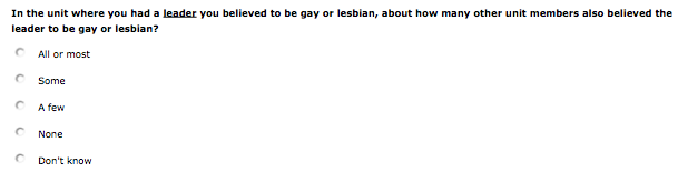 However, totally agreed with you and Silver that this is a stupidly flawed survey for a good chunk of the questions – it is more or less useless, as well as rather offensive, to ask servicemembers to spit out their gaydar (or paranoid homophobia) about their peers and leaders, potentially outing them under DADT. (The anonymity/privacy issues with this survey, beyond minority bias, are RIDICULOUS in terms of the potential for outing oneself / one’s unit leader or peers, so I think the results will be neither valid nor reliable, as you say.)