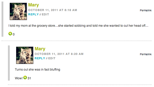 Emily got it! No hidden meaning…just a very dramatic mother. I’m pretty sure she didn’t ACTUALLY want to cut off her head hence the “bluff”… I thought it was funny because it was the most rediculous thing I’ve ever heard her, or maybe anyone, say. Sometimes me and my brother call her “The mom who cried decapitation” or “nearly headless mom”.