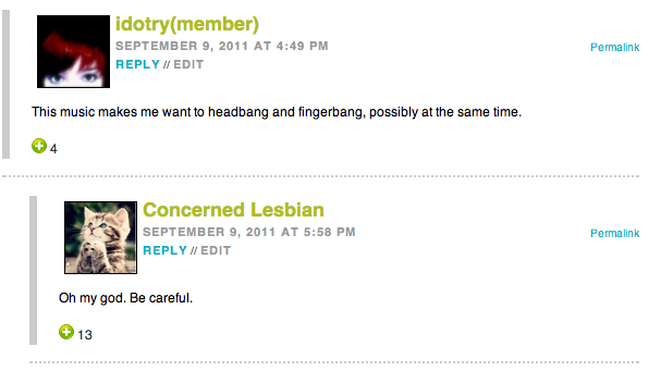 Hello thrill-seekers. Welcome to another week of comment awards. Today I went on a long walk in the woods WHILST WEARING A SWEATER. It was a thoroughly pleasurable experience. Since autumn (or spring if you live upside down) is on its merry way, we’ve got a fall television guide and the winners of the summer book club.The Lady Killer Tour just might be coming to a town near you soon, but even if they’re not you can keep up with them via their touring video diary. Tully loves women with guitars in general, and told you all about it. If you’re headed off to school, we’ve got you covered. You can now handle homophobic roommates, anger, and juicing, which is not necessarily school-related but definitely can be. For those of you who are members of the labor market, Rachel has ideas for your lunchbox and Riese created a kit especially for all you servers out there. Bless your souls. Lizz likes silky scarves, Rachel’s got notes on being an anarchist housewife, and Meghan visited Istanbul. Jess interviewed Kelsey from The Real L Word and your latest Unicorn Plan-it teaser featuring MobileOm is out.