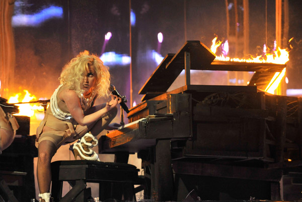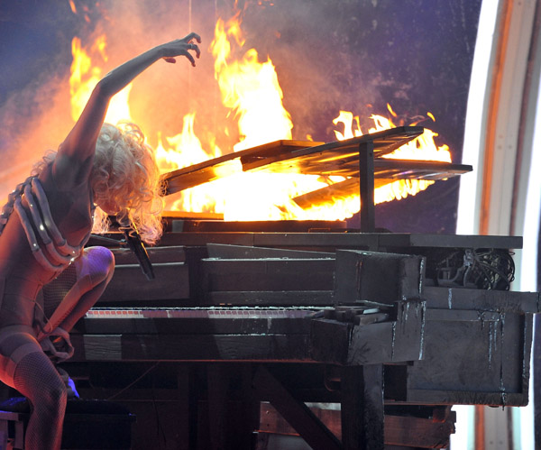 Lady Gaga’s hair was down, literally. Her first costume was flesh & bone and her second was the same but consumed in smoke. There was a violinist in a glass cube, and a bottle broken on a piano and things lighting on fire.
