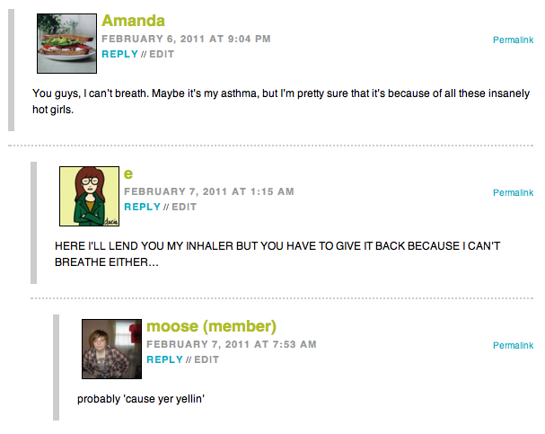 So many things happened this week! Holly Miranda answered your questions and we discussed her album The Magician’s Private Library, Riese & co. liveblogged the Superbowl in which someone won and one of our commenters got to have sex, and Robin and Alex debuted the first two 2012 CALENDAR GIRLS! Also: some ideas for buying cologne or perfume, Rachel discusses the second book in our bookclub, The IHop Papers, Riese tells you why Planned Parenthood is important (seriously!) and IT WAS LANEIA’S BIRTHDAY GO TELL HER YOU LOVE HER.