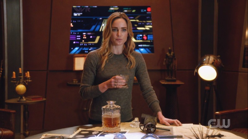 When the rest of the team returns to the Waverider, they find Sara there, pouring herself a drink.