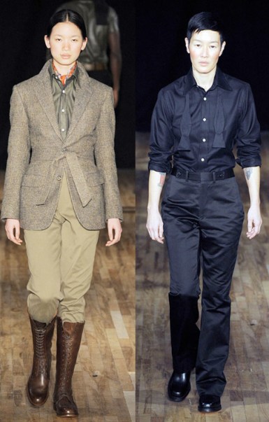 Lesbian model Jenny Shimizu walked for John Bartlett’s “return to womenswear.” I like a womenswear designer who still is kinda designing menswear. See there she is in the black suit: