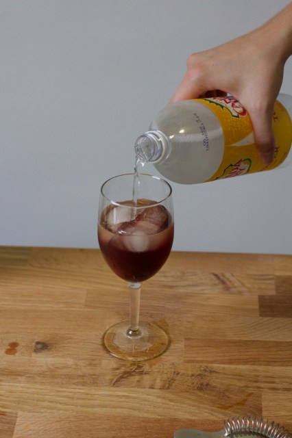 This is named for its lovely color — a nice rich purple. And it’s very sweet. Grab a wine glass and fill it with ice. Dump the crème de cassis in the bottom of the glass, the 3 oz Lillet on top of it.
