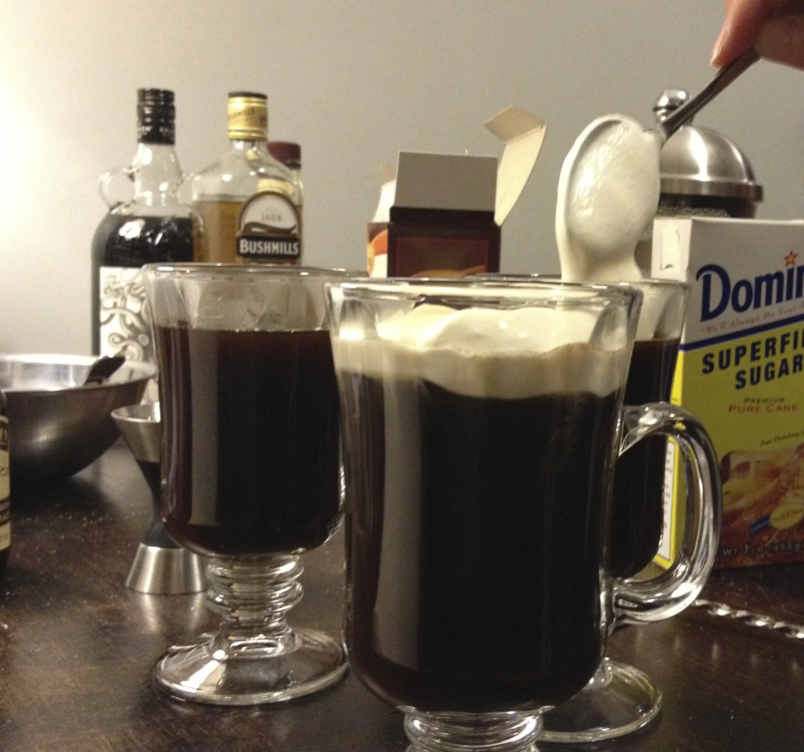 Top tip (from someone who worked in a bar in Ireland for three years, which worked out at about 800 Irish Coffees and a short-lived hatred of anyone who dared ordered one when it was busy): If you stop whipping the cream before it “peaks” and spoon it on slowly via the back of another spoon, the worlds of coffee/whiskey and cream won’t collide..until you slurp it down.