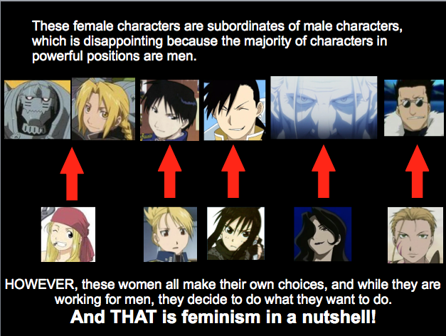 This brings me to one of the few places where I disagreed with the panelists: the issue of choice. Their conclusion was, because these characters chose to follow men, FMA ultimately wasn’t sexist. However, while I agree that “choice” is an important part of feminism when it comes to real-life women (though, it shouldn’t mean we don’t examine how societal gender programming influences said choices), it doesn’t quite apply to fictional characters, who literally don’t have agency – their choices are determined by their writers. Ultimately, it’s very easy for an author (like Twilight author Stephenie Meyer, who also uses this defense for her own books) to give his or her female characters a pattern of choices that are in line with restrictive gender expectations and that define them around men, by making it as though it’s the female character who wants them that way. And when it’s a pattern, as it is in FMA, it can suggest troubling things about “what women want.”