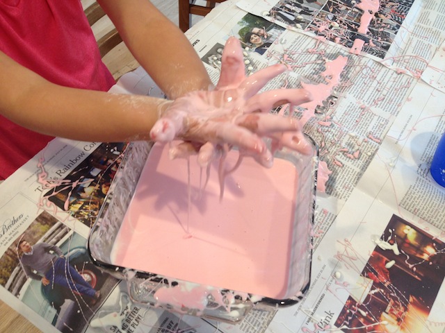 You can make a whole lesson about this if you want, or make up a story that it’s a secret substance from space. Or not. The six-year-old I made this with thoroughly did not care about the phases of matter represented in her hands, but she have a thoroughly good time. The point is not really to make anything with the Oobleck. It’s just a cool substance to feel and play with. The one thing you can make is a mess, but it cleans up really easily.