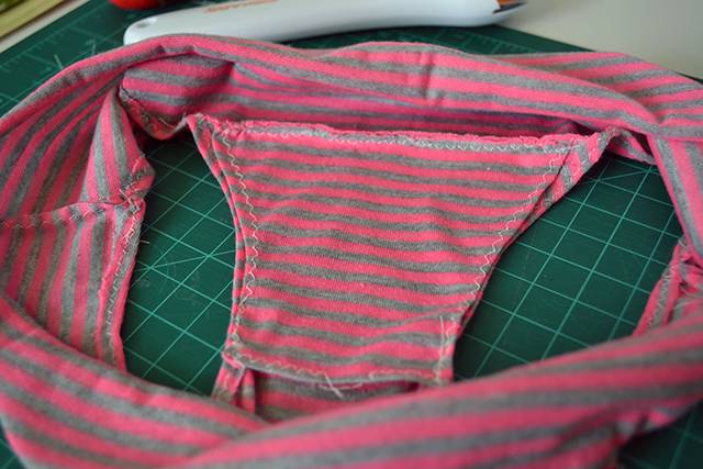 7. Try on your underwear. My cat is really excited to be modelling for you. Keep in mind that if your fabric edges roll, they’ll seem a bit small until you sew the leg holes and the top seam to keep it from rolling. You want to be comfortable in them. If they’re too big, take in the sides slightly, and if they’re too small, well, you might have to add a bit of fabric at the sides or start over.
