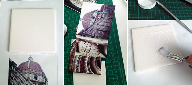 2. Cut out those photos. I cut out mine by placing my tile on top and exacto knifing around the edge to get them to fit perfectly.