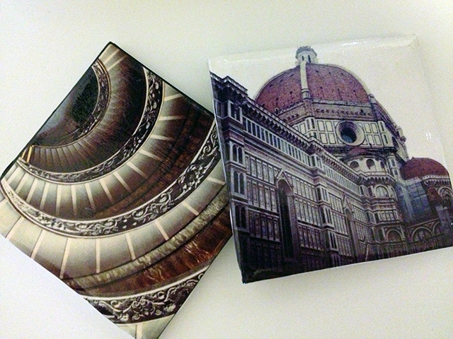 1. Find the photos you’d like to use. I stole these off of my BFF4EVA’s Instagram because these coasters are for her. She took these photos in Italy because she’s an art history nerd. Point of this digression: Find some meaningful photos. Maybe don’t use photos of with people’s faces because it’d be weird to put your drink on someone’s face. Maybe that’s just me. Anyways. Instagram is the easiest because they are already square but find whatever you’d like. Resize them to 4″ by 4″ (11cm by 11cm) and print them out.