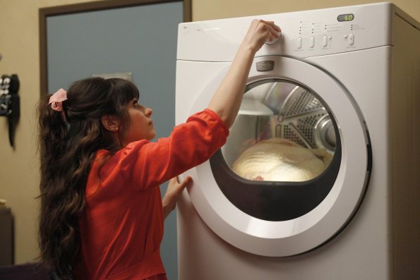 Is Zooey Deschanel really putting a turkey in a dryer there? Really?
