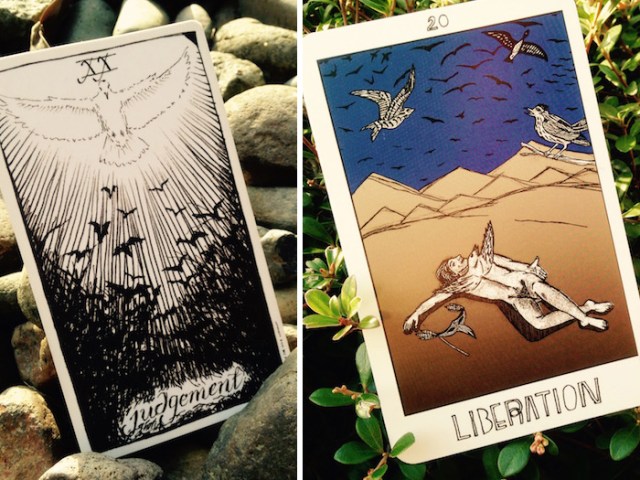 There are so many biblical connotations in this card it took me a long time to make peace with it and realise that its message is powerfully, beautifully liberating. In fact, in The Collective Tarot, it’s called ‘Liberation’ and that’s a title I greatly prefer. This comes right at the end of the ‘fool’s journey,’ right before the wholeness and complete fulfillment of The World. What must we do to get to this place of completion? Judgement/Liberation says we must face up to everything that has gone before, accept ourselves as flawed, beautiful, mistake-making, ever-growing works in progress, forgive ourselves for all the shit we got wrong, and with this real, deep self-knowledge, let it all go. It’s nakedness, vulnerability. It’s hard! We want to move on, to be reborn, but we shy away from facing up to our fears and regrets. Judgement says that doing this is the only way to rebirth.