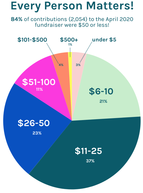 We need to cover about 29% of our expenses through the end of the year, nd we’re aiming to spend $82,000 a month from August through December 2020. That’s what it costs to pay our writers and artists, freelancers, and our full-time team, contractors and all those myriad things like server fees. That 29% equals $118,000; that’s the amount we’re hoping you’ll help us raise. I know it seems like a lot, but I want to show you the chart (which Sarah gave a colorful facelift) from the last fundraiser. We raised over $132,000 in April 2020, and we did it with mostly gifts of $50 or less. Every contribution matters! I feel like LGBTQ people coming together and pitching in what they can and keeping a website that is by and for us around is just, IDK, powerful?