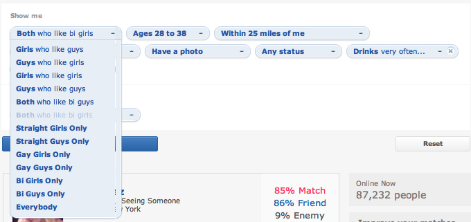 As far as online dating sites, OKCupid is absolutely the most bi-friendly of the major leaguers in terms of how you’re allowed to define yourself. Most of the bigger sites disappointingly will only allow users to list themselves as seeking exclusively men or women, which can be inconvenient, insulting and annoying (Seriously JDate, my Jewish grandmother is VERY disappointed in you). Certainly, OKCupid’s users identify all over the map in terms of gender identity and sexual orientation, but it’s refreshing to have a recognizable space between gay and straight to even exist in. I can’t believe it’s taken this long for ONE site to offer this simple option.