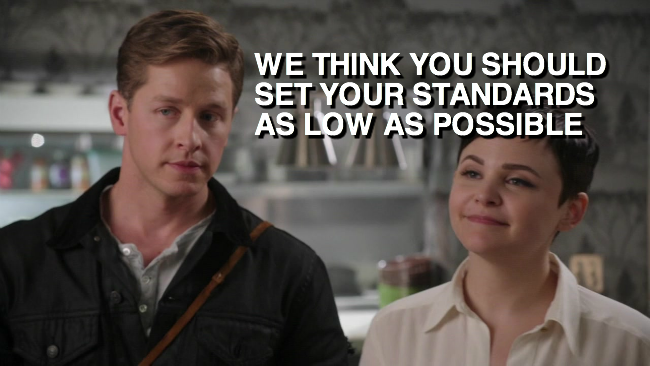 Quick question for the writers: Regina’s son has been returned home after a grueling and scarring ordeal, and yet we have not seen the two of them together as mother and son or together, period. It’s been fifteen minutes of screentime already, and Regina’s acting like Henry is a friend of a friend she ran into in the grocery store. You know, like when you see them in the meat section but you kind of avoid making eye contact and then you run smack into each other in the cheeses so you have to actually say hi and acknowledge each other but then you keep passing each other in the more narrow aisles and do you smile or do you keep saying hi or do you laugh awkwardly or do you stare at your feet or what? ANYWAY. I really hate when you guys, the writers, which is a term I am using loosely, shove the characters around in miniature episode interactions that completely deny them their actual personality traits or actions congruent with their arcs thus far. But hey, I’m the one who sat down to watch this festering sore of a show. I knew what I was in for when it started, and I should own my mistakes.