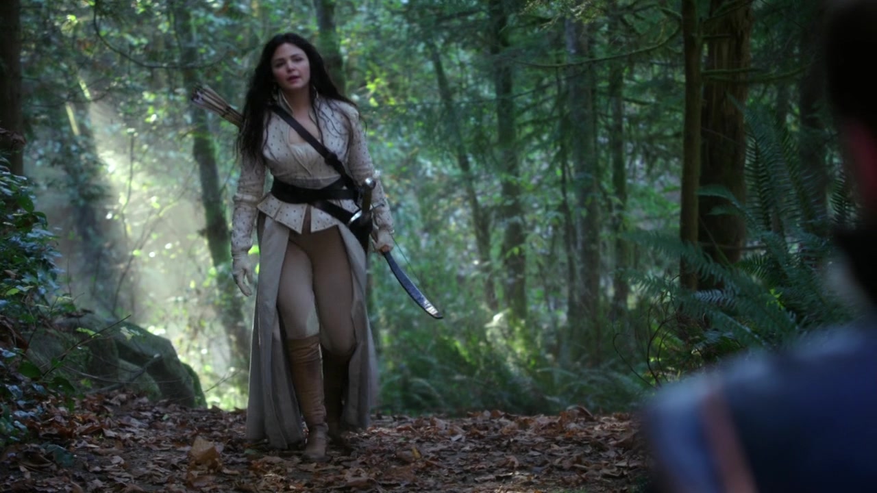 Snow’s wearing a garment that could only be described as the least appropriate thing to wear on a high-stakes manhunt, especially with that drowned poodle of a wig she’s sporting. Think of all the stuff her hair’s gonna get caught on, think of all the ways those long unnecessary strips of fabric could trip her ass up. Snow’s plan for taking care of Regina is killing Medusa and using her head to turn Regina to stone. Surely there must be an easier method of defeating one’s enemies than hunting down a highly dangerous mythical beast, slaying it, and then transporting its remains to the lair of your enemy where you will somehow kill your enemy on her own turf where she has the clear advantage.