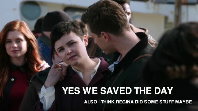 The hookup is interrupted by the ship blasting through the atmosphere and gently docking in the harbor like a ship blasting through a hole in time and space could land in water without so much as a minute disturbance. Then again, the budget for CGI in this episode was $9.32, and they were already counting quarters out of the laundry to cover that poor excuse for a Medusa. Everyone’s getting off the ship and having ooey gooey reunions like life-risking situations aren’t par for the course in this town. Regina stands awkwardly to the side because she’s allergic to bullshit. Everyone’s congratulating the usual useless subjects for saving the day, but Snow says they wouldn’t have been able to do a lot of it without Regina.