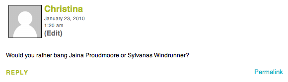 And Jaina is cool and all but on top of being a little vanilla, Thrall and Arthas are the last two guys I’d want to compete with for anyone’s affections.