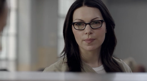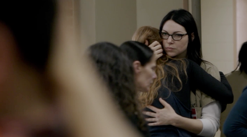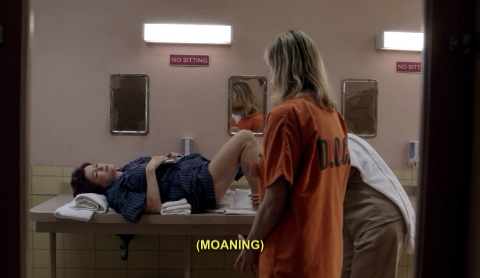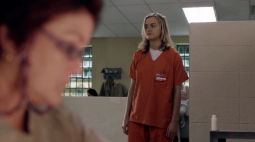 Piper attends prisoner orientation, which is pretty identical to my required 5 hour driver’s ed where a guy with a mullet told us “little ladies” that we were always doing our makeup while we drove, silly us. There’s a vacant seat next to Alex, who gestures towards it. Piper takes the broken non-working uncomfortable chair over Alex, which I believe is some kind of metaphor for Larry. You can sit on it all you want, but you and your ass both know it’s not doing the trick.