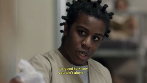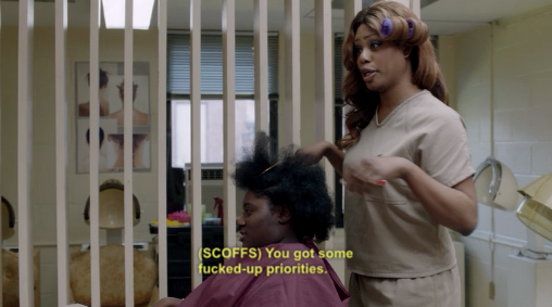 Piper goes to Sophia to try and get shea butter or cocoa butter. Sophia is only going to do it for a price. That price turns out to be Taystee’s new blonde streak. I love Taystee, I love Sophia, I love everything.