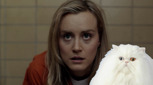 Sue (or Crazy Eyes, but I’ll refer to her as Sue because I have a lot of feelings about this character and her dehumanization) comes in as Piper is peeing. Sue is making romantic eye expressions at Piper during said peeing. I can see how this might be awkward. To make it less awkward, I’ve inserted a cat into this scene, as cats improve everything that could possibly go bad for a homo.