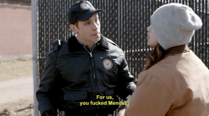 Well, Operation I Wish This Wasn’t Your Sole Option is happening. Caputo’s hanging up posters for the Christmas pageant, and Mendoza is chatting him up about shower fungus. Apparently the Latin@ group wants Sue to clean their showers, too, because she’s meticulous and they’ve got said fungus problem. The shower fungus is clearly a distraction, but ew. Shower fungus. You know what’s not at A-Camp, surprisingly enough? Shower fungus. You should go to camp because there’s no fungus in our showers. Morello makes a birdcall – because there are a lot of owls in prison, just chilling and making noise, not out of place at all, and Mendoza cuts the conversation off. Morello tells Caputo someone is crying in the utility closet. Caputo goes to check it out, because remember last time someone was sad in the utility closet, and finds Pornstache and Daya having sex. Well, then.