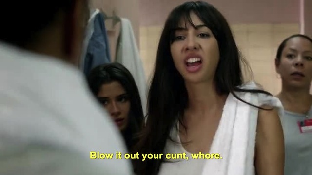 So Gloria and her girls head to the bathroom in B-Block and are met with immediate resistance from Taystee and Black Cindy and basically everybody. Gloria says nobody gets breakfast until her crew freshens up. Then Vee emerges from the swampy hellscape where she ingests whatever sour poison replaces the blood in her veins to inform Gloria that her “girls” are “not inclined to offer special privileges.” What does that even mean.