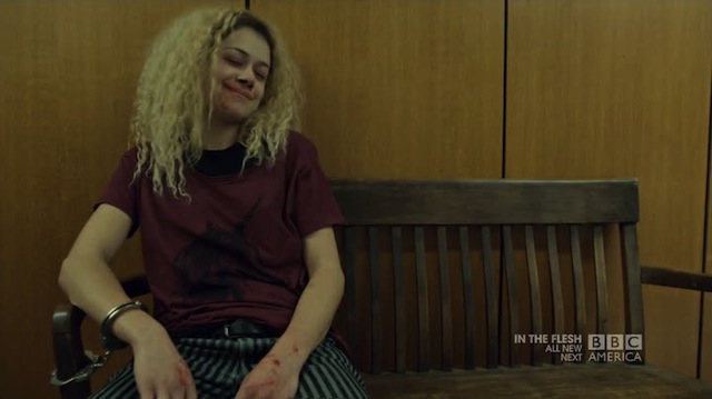 At the police station, Helena is handcuffed to a bench and asking for her boyfriend. The guys aren’t pressing charges, so she’ll be free to go. The cop tells her that her sister is there to pick her up, but its not Sarah, it’s Gracie.