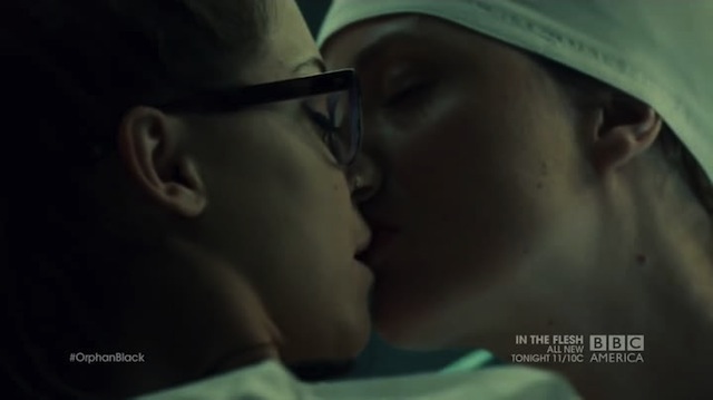 I think that’s exactly what was happening. Granted, that doesn’t totally eliminate the weird juxtaposition between very clinical science thingy and romantically kissing your girlfriend, but I guess their relationship has never been cut and dry. After all, Cosima is the scientist and the subject and Delphine is the girlfriend, the other scientist, and the monitor.