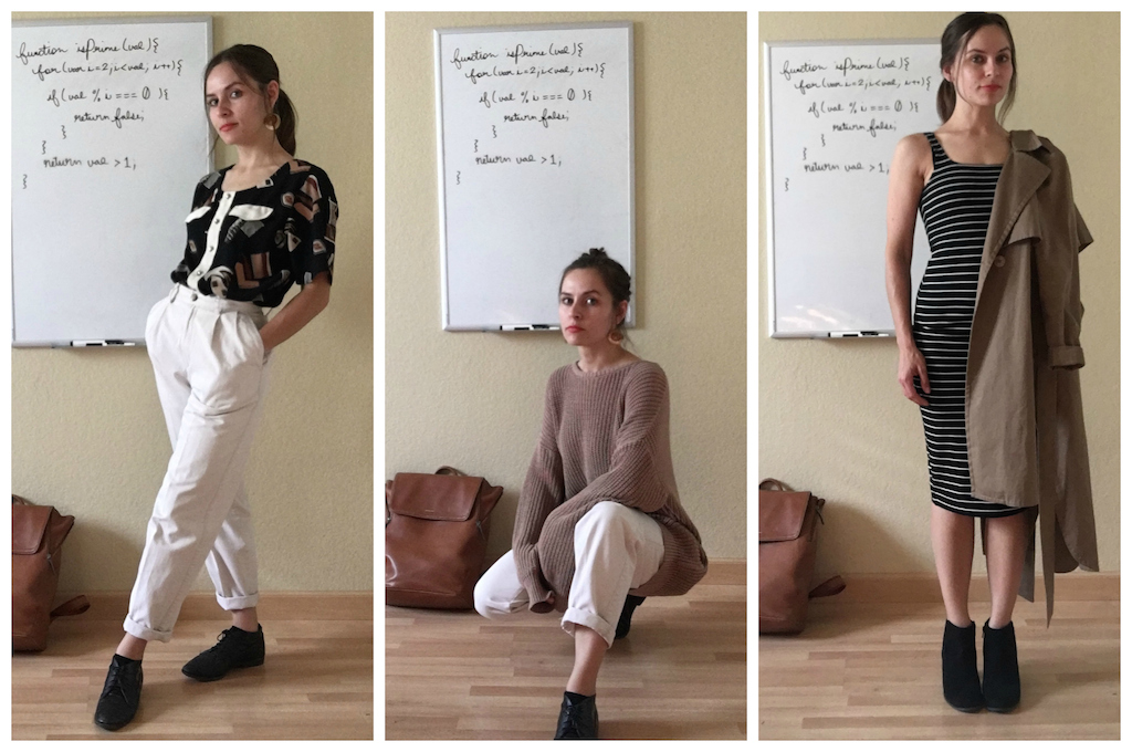 “These are my take on andro dresses for work. I find it really fascinating how the smallest details can tip an outfit to one side or the other of the gender presentation divide, and I like to play with that balance. (The unimpressed face in the second photo is due to the seven billion previous photos that turned out blurry.)”