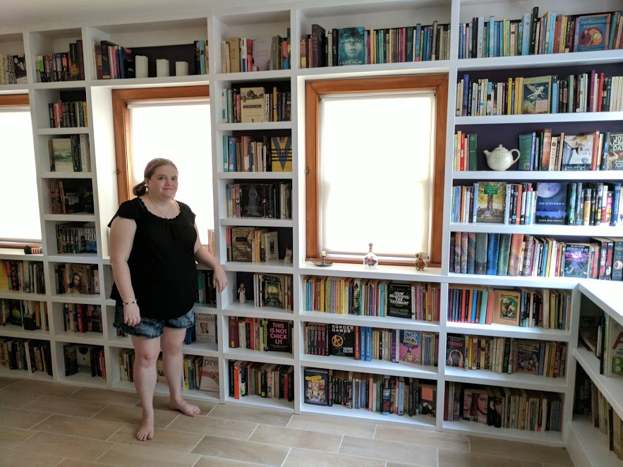 “Pictured is a portion of of my adult fiction section and most of my young adult fiction section. We had a built-in library put in a couple years ago; it lines the room and I love it. My favorite book would be a tie between CS Lewis’ Till We Have Faces, which you can see on the third shelf up behind me if you squint, and Emma Donoghue’s Room, which you can’t because it’s off-screen. Many of my favorite books are faced out though.”