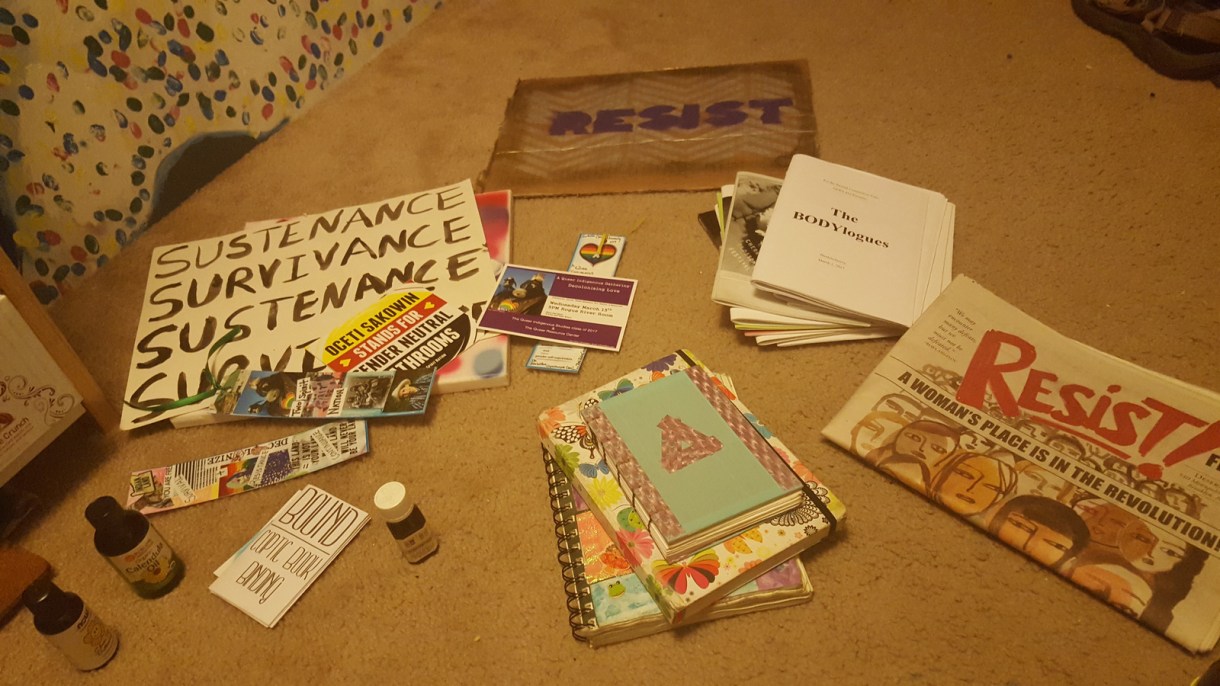 “I spent this Friday alone reorganizing my bookshelves and putting some recent art up on my door/walls. Also trying to figure out what to do with all these toothpick flags (had queer Indigenous studies terms/concepts) left over from a baking project for a queer Indigenous gathering two days prior. It was lovely to take some time to reorganize and appreciate the things I had created lately.”