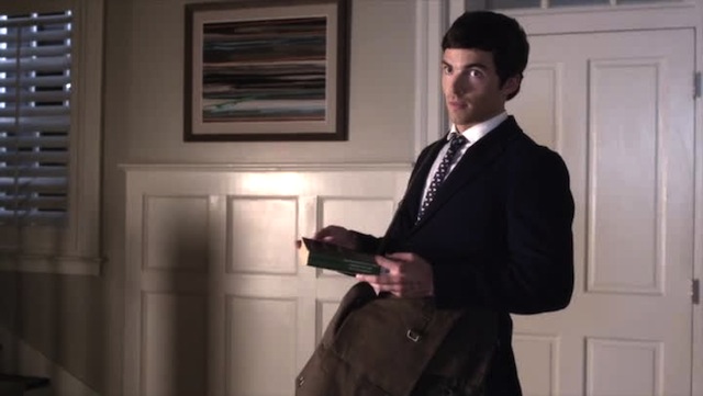 Elsewhere EzrA swings by Hanna’s house. Obviously he’s looking for the journal. Ashley lets him in and he goes off on some excuse about how Hanna might fail his class if Hanna doesn’t turn in few assignments. Ashley doesn’t think this house call is weird despite the fact that this is the sort of meeting that generally takes place at school. Or like on the phone.