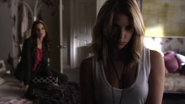 Back in the choir room (#continuity from the last episodes), Alison and Hanna are celebrating their one millionth conversation about how their group is falling apart. Hanna tells Ali that her stunts affect other people, which really does seem to be something Ali doesn’t realize or care about, but since this is national No One Listens To Hanna Day, Ali patly ignores it. Hanna tells Ali to stay with one of the other girls because U-Hauling makes her uncomfortable.