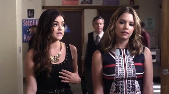 Ezra catches Spencer and is mad about an essay that Spencer phoned in. Spencer is trying to act like she doesn’t give a fuck about the essay, but seriously, I think the acting direction in this scene for both Ezra and Spencer was, “Just open your eyes as wide as you can and blankly stare at one another.”
