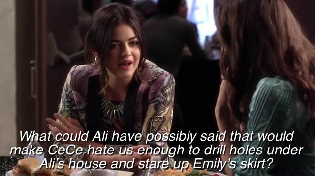 Hanna, upon hearing this terrible news, storms off to go start the revolution or maybe just to go cry in a corner. I find they’re often the same thing. The other Liars catch up with her and the girls hatch a plan. They figure Badass Lezzie Detective needs a push in the Cece direction. So where to go for incriminating evidence? Duh! The crawl space!