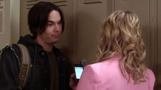Inside, in his class of language and despair, sad-sack Ezra hangs his head and sits like he forgot to DVR Breaking Amish. Remember, he just “lost” his “son.” Emily walks in because they’re bffs and also because Ezra’s helping her with her college apps.