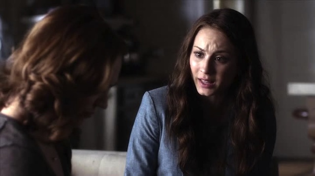 Mona finds Paige in a dark alleyway and murders her — nah, just playing with you, she finds her and threatens her life, instead! Maybe. She tells her in no uncertain terms that unless Paige is with her, she’s against her, which means Paige is with Emily and Emily is with Alison. Don’t do something stupid, Paige! Please!