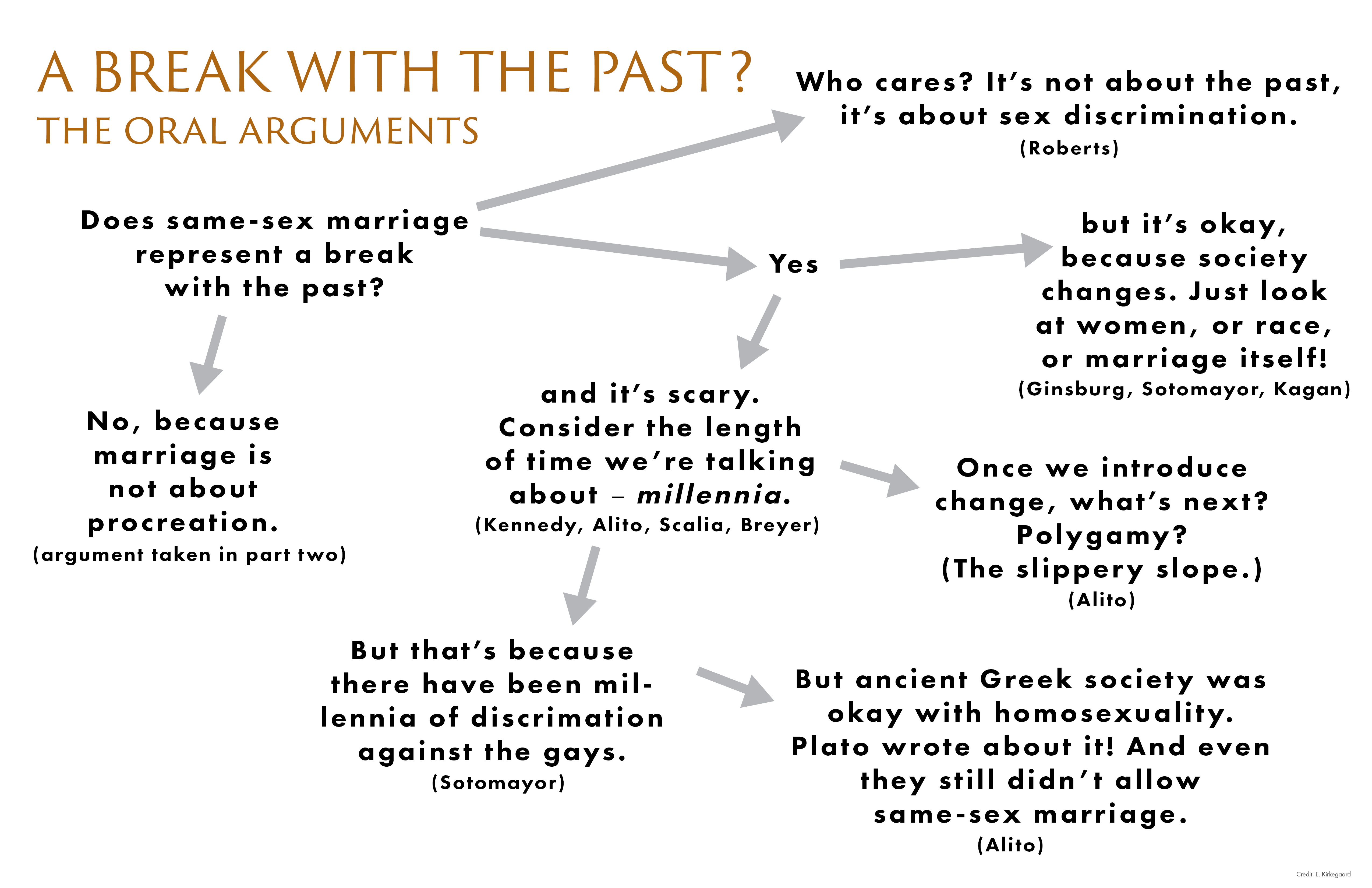 “You wouldn’t be asking for this relief if the law of marriage was what it was a millennium ago. I mean, it wasn’t possible. Same-sex unions would not have opted into the pattern of marriage, which was a relationship, a dominant and a subordinate relationship. Yes, it was marriage between a man and a woman, but the man decided where the couple would be domiciled; it was her obligation to follow him. There was a change in the institution of marriage to make it egalitarian when it wasn’t egalitarian. And same-sex unions wouldn’t fit into what marriage was once.”
