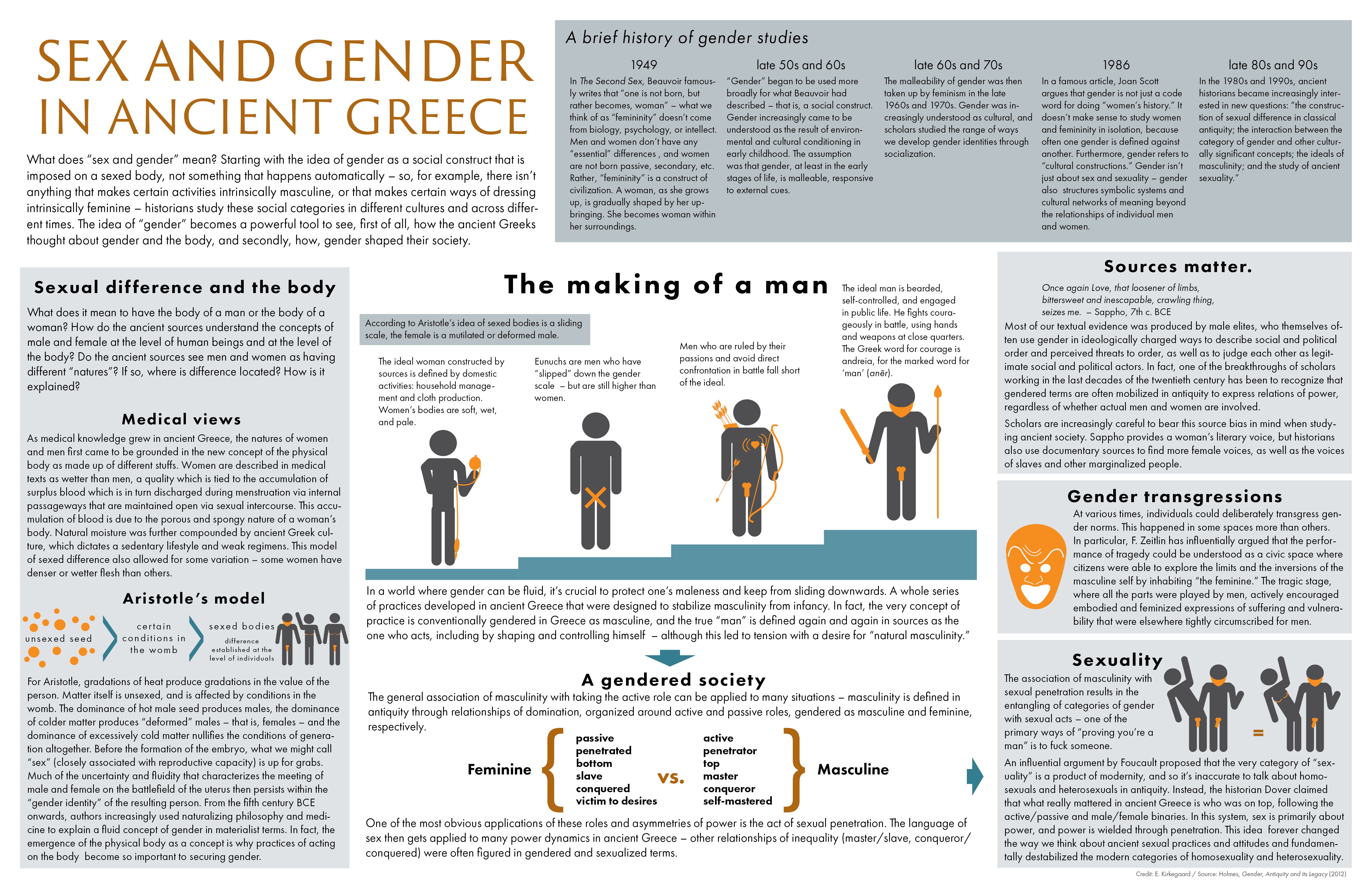 This brings us to an important realization – not only does our understanding about what happened in the past have an impact on our laws today, but even our ideas about how to study the past (which we might call “theory” or “methodology”) have an effect. This means that antiquity gets a double whammy, because not only do ancient Greece and Rome hold a privileged place in Western culture (for a whole host of reasons), but also a lot of really important theory about sex and gender was written and conceived through thinking about the ancient world. Antiquity, especially the literature of ancient Greece, has been a kind of sandbox in which people like Michel Foucault, Judith Butler, and Luce Irigaray have done a lot of their important thinking.