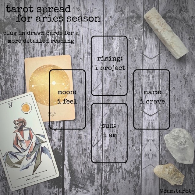 In this season of Aries, remember who you are, all of the magic you hold, and the path forward that you are creating. Experienced tarot readers or astrologers can plug the cards Iāve drawn for their sun, moon, and rising signs into the spread template below to create a custom reading for this season. Aries is ruled by Mars, so if you know your placement for this planet of courage and combat, include it in your reading for a more detailed look into your season ahead.