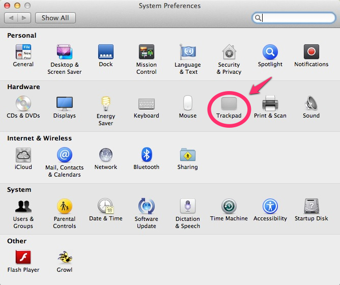 Click on Trackpad. See? I circled it for you. I chose pink because my soul is made out of pink cotton candy. Then you’ll get to the magical land where all the shortcuts live.