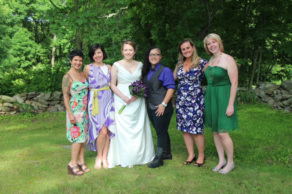 One of my favourite memories of queer attire/existence in reference to weddings was at a wedding in Halifax, Nova Scotia (I live in Vancouver). An older woman, watching my then partner and I slow dancing, me in a sexy dress, and she in dress pants and a button down shirt, looked over at the bride (a good pal of mine), and slowly said, “They’re not sisters, are they…”