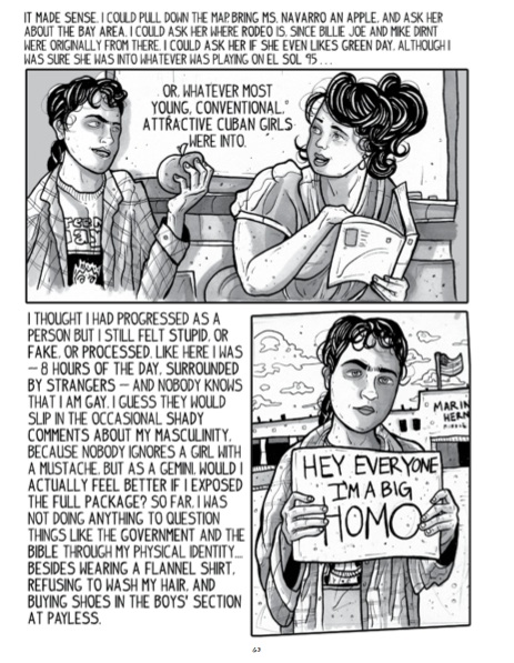 Reading Road’s memoir, I was right there with her. As she admits how easy it is to stay in the closet when you don’t know any other queer people, and then describes her life-altering joy upon first seeing a girl with a shaved head, my heart was pounding. And in those same pages where she mulls over her brand new first crush on the “bald girl,” Road draws herself holding her own face, surrounded by screaming words like “DYKE BITCH!” and “FAGGOT” and “TORTILLERA!” In this one drawing, Road hits a truth about being a young queer person: that you don’t have the luxury of being simply excited about a crush when those feelings symbolizes your deeply-rooted otherness.