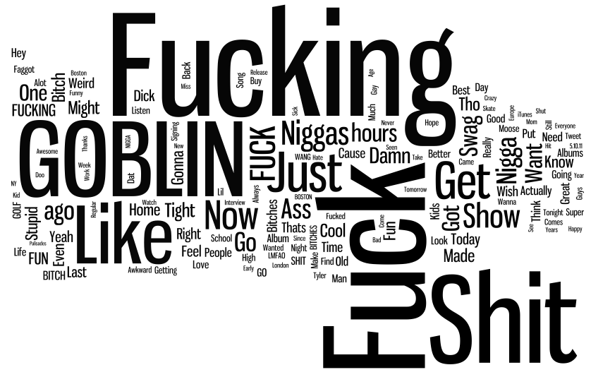 Notorious for his shocking lyrics, Tyler takes not giving a fuck to a whole new level. Actually, he gives a lot of them in the sense that “fuck” appears to be his favorite word. Here you go, I made a word cloud for you of his twitter feed for the month of May so that you can observe his genius.