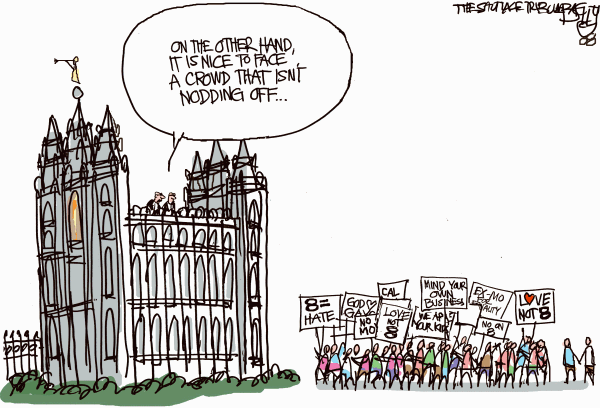 Since I’m guessing that opinions on the LDS church around these here parts range from just tolerant to loathsome, it’s worth asking why we’re talking about some guy who thinks it’s rad that not all Mormons live in little boxes made out of ticky-tacky. First: there are countless gay Mormons who are being affected by the church’s policies every day who deserve our solidarity. Second: the church has 14 million members, billions of dollars, and some serious political clout. The tide might be turning in favor of LGBT rights in secular society, but the LDS church and other religious institutions are standing in the way of progress — and the fact that their funding and political support was a MAJOR factor in the passing of Prop 8, it’s very worthwhile to think about what we can do to help them become more openminded. Despite how silly its religious tenets may seem to people outside the church, the LDS power structure doesn’t seem like it’s going anywhere soon.